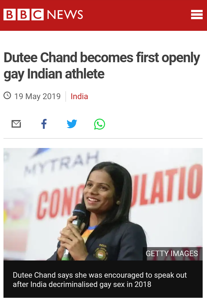 As has been the template of her of life, she has once again stood her ground and blazed a new trail becoming the first Indian sportsperson to come out as โgayโ. Dutee Chand slowly but surely is turning out to be an icon.