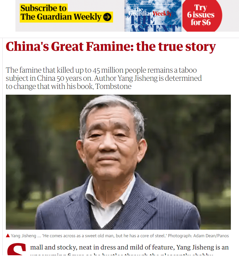 Yang Jisheng, a former media professional who worked in the Chinese state’s news agency and a survivor of the Great Famine talking to the then China Correspondent of The Guardian, Tania Branigan about his to be released book Tombstone described the horrors of the famine.