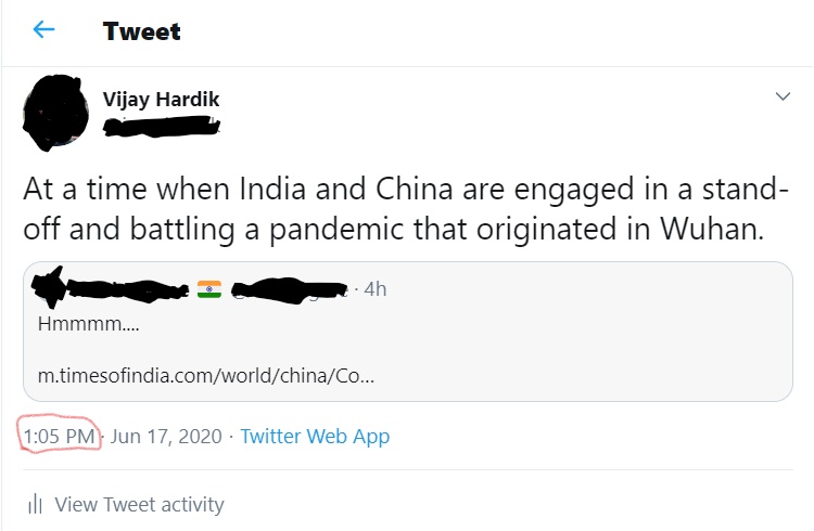 Looking at it in a chronological order, my last activity before tweeting on the India- China face-off was a retweet. The time stamp of the tweet places it at 1:05 pm.