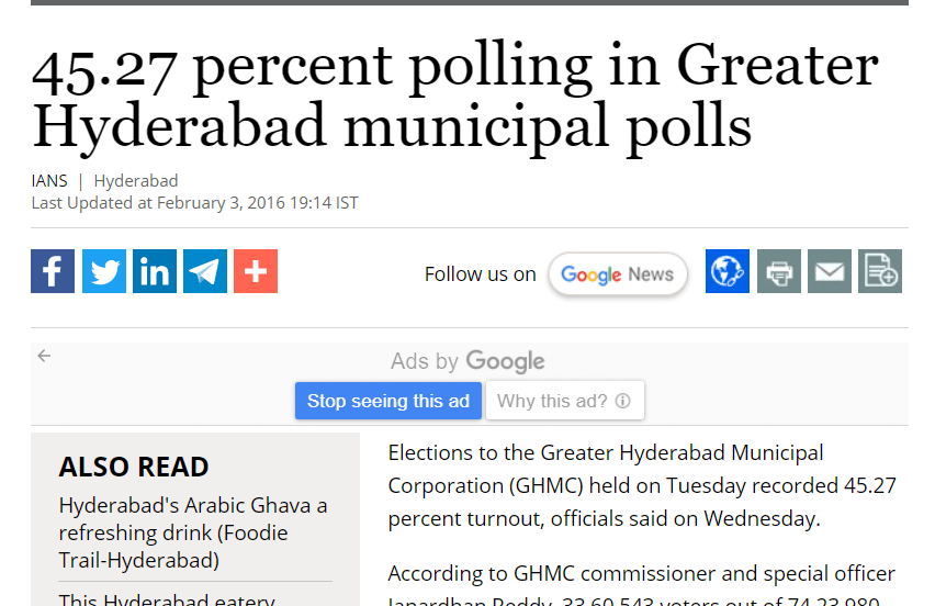 [1] Business Standard โ Feb 2016: 45.27 percent polling in Greater Hyderabad Municipal polls