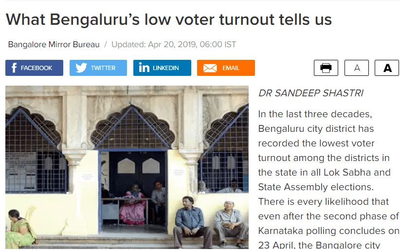 Bangalore Mirror[4] discusses the reasons of apathy. Names of eligible voters go missing from the electoral rolls. This indifference shown by the system begets indifference of the public. It tells them they do not matter. They believe their participation does not change the political landscape.