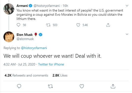 Tesla owner Elon Musk welcomed the coup in Bolivia. He was widely criticised on the internet for his comment. To which he tweeted back, “We will coup whoever we want! Deal with it.”
