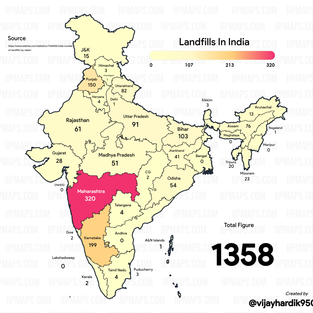 The 0’s on the map do not denote a lack of landfills in these states. The zeros on the map are only evidence of a lack of data on landfills in the respective. This data set for the financial year 2020 has the landfill data on Union Territories – Jammu & Kashmir and Ladakh combined together.