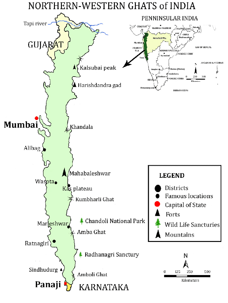 In Maharashtra, it has an average elevation of 900 to 1,200 meters. Famous peaks include Kalsubai (the highest peak in Maharashtra at 1,646 meters), Harishchandragad, Mahabaleshwar, and Rajmachi.