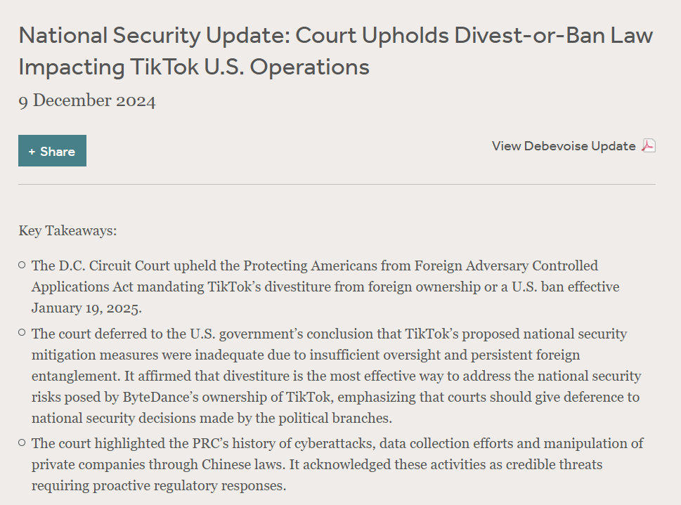 Upholding the stipulated rules of PAFACA, the court mandated the divestment of TikTok from foreign ownership. Or it would effectively face a ban from January 19, 2025. Agreeing with the stand of the US government, the court concluded TikTok’s safeguards against Chinese national security laws are inadequate. And upheld the government’s decision to force TikTok to divest its business in America.