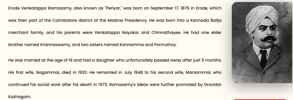 Teja: So, Erode Venkatappa Ramasamy(Periyar) was born into a Balija Naidu family—a Telugu-speaking trading community(few say from Karnataka), generally classified as an upper Shudra caste. He came from a well-to-do merchant background. He dropped out of school early and got involved in the family business.