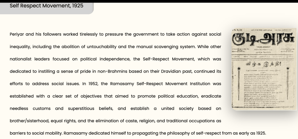 Teja: We’ll get to that, but first let me give you a bit more background on Periyar. After the Kashi incident, he launched his movements against caste discrimination and Brahminical dominance.